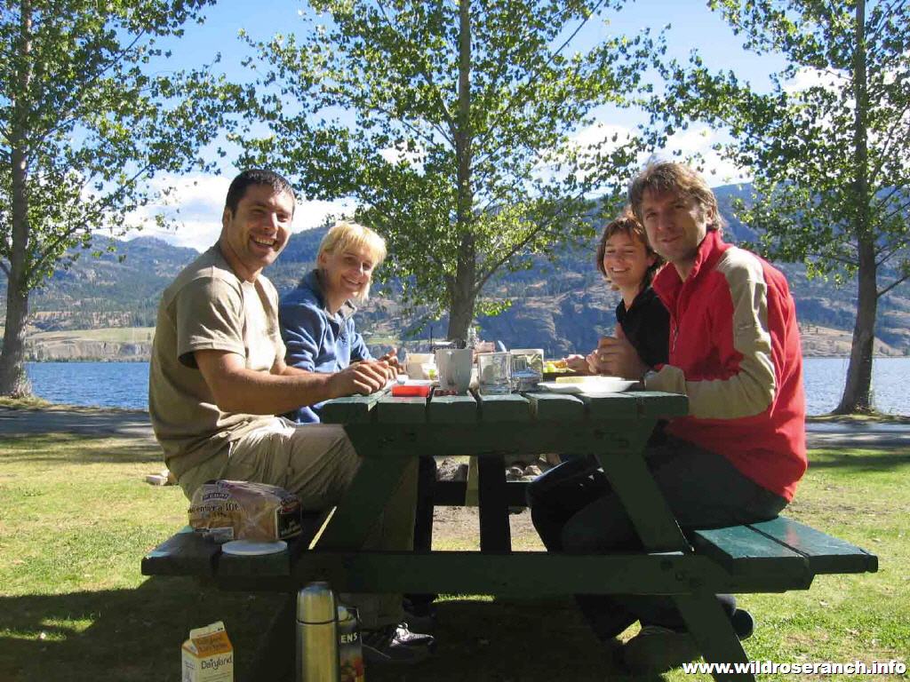 Da wir uns erhoffen noch einige Tiere sehen zu können, nehmen wir die Weiterfahrt früh in Angriff. Bald sind wir in „Princeton“. Zum zweiten Mal. Leider bleibt es bis anhin bei einigen Rehen. Jetzt telefonieren wir mit Yves und Murielle wo sie stecken. Da sie auf einem gemütlichen Campingplatz am See sind und gar nicht so weit weg (114km) beschliessen wir dorthin zu fahren. Auf dem Hinweg dürfen wir doch noch einen Schwarzbären entdecken! Unterhalb „Penticton“ stossen wir dann zu unseren Freunden, die uns glücklicherweise ihren Nachbarplatz reservieren konnten. Nach einigen Erfahrungs- und Erlebnisaustauschen, grillieren wir unser Nachtessen. Nach dem abendlichen Spaziergang durch die Apfelplantage (deren Äpfel natürlich probiert werden müssen) und dem Selbstauslöser Fotoshooting, lassen wir den Abend am Lagerfeuer bei einem (zwei) Glas Wein ausklingen… |