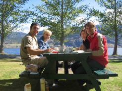 Nach dem wilden Abend schlafen wir aus. Wir möchten uns das Indianer Museum anschauen, aber die Indianer scheinen noch länger zu schlafen als wir. Mit einigen anderen warten mit viel Geduld, als diese aber aufgebraucht ist fahren wir weiter von „Kamloops“ Richtung Süden. Es ist ein heisser Tag. Kurz nach Vernon geniessen wir auf einem „View Point“ bei schönster Seesicht unser Mittagessen. Nach „Kelowna“ machen wir Schluss mit Fahren für heute. Baden im „Okanagan Lake“ ist angesagt. Direkt am See finden wir einen Campground.