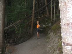 Es hat die ganze Nacht geregnet. Während des Zmorgenessens hört es aber auf und alsbald machen wir uns auf die Räder. Kurz nach „ Little Fort“ gelangen wir nach „Clearwater“, wo wir uns im Visitor Info nach Wanderwegen und „Interesting Points“ erkundigen. Bei einer grossen Stromschnelle sollen die Lachse springen, das wollen wir uns nicht entgehen lassen. Da angekommen, Rucksack geschnallt, machen wir uns auf den Weg. Wir wandern ca. eineinhalb Stunden durch urchigen, vermoosten Wald dem Fluss entlang. Belohnung: schöne Landschaft, 1 Fisch, null Bär. Am Campground „Clearwater Lake“ nehmen wir eine „Site und schnallen noch mal den Rucksack. Noch einmal klettern und laufen wir durch dichtesten Wald, um versteckte kleine Wasserfälle zu finden „Sticta Falls“. Während wir am Flussufer des Camps entlang wandern ziehen dicke, schwarze Wolken auf. Kurz nach eintreffen im Camper beginnt es wieder leicht zu regnen. Nach einer wohltuenden Dusche im Camper und feinen Spaghetti Carbonara, beenden wir den Tag mit einer weiteren Rund „Tschau Sepp“! |