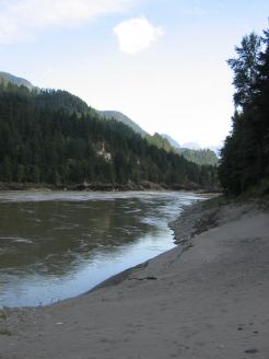 Nach erneutem Wassertank füllen und Abwasser entleeren machen wir uns auf den Rückweg nach „Quesnel“. Einige Male halten wir an um Elchkühe mit Jungen und Rehe zu beobachten. In „Quesnel“ rechts abbiegen und weiter geht’s nach „Prince Georg“ wo auch die „Cariboo Road“ ein Ende hat. Am nördlichsten Punkt unserer Reise angelangt, nehmen wir den weiten Weg auf dem „Yellowhead Hwy“ in Angriff. Stundenlange Fahrt durch den unbesiedelten, unerschlossenen Landstrich. Wunderschöne weite Wälder soweit das Auge reicht. Plötzlich eine Bewegung auf der linken Fahrbahnseite. Am Waldrand taucht ein schwarzes pelziges Tier auf, wir sehen den ersten Bären! So schnell wie er gekommen ist, ist er wieder weg, keine Zeit um Fotos zu machen. Völlig überwältigt fahren wir weiter durch Wald, Wald, Wald… In „Mc Bride“ tanken wir voll und kaufen ein. Kurze Zeit später machen wir Stopp bei den „Rearguard Falls“ und sehen einige Lachse springen. Für den Rückweg ist Eile angesagt, denn es beginnt zu regnen. Als Nachtlager steuern wir „Lucerne“ an ein Camp am River. Die „Motzis“ erwarten uns schon, sie unterhalten uns herrlich. Der Ranger begrüsst uns „Swiss Guys“ herzlich. Es regnet… |
