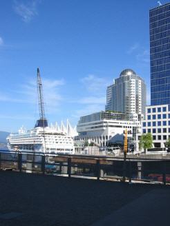 Nach 13 Stunden Flug und Zwischenlandung in Calgary, landen wir auf dem Vancouver Flughafen. Schnell ist ein Taxi gefunden, dass uns ins Pan Pacific Hotel bringt. Wir kommen aus dem staunen nicht mehr raus, dass Hotel ist riesig und das Zimmer dem entsprechend grosszügig. Die Fahrt mit dem Hotellift verschlägt uns den Atem, ein rasantes Tempo! Nach einem kurzen Ausflug in die Stadt und einem einfachen Abendessen, fallen wir schon um 20.00 Uhr müde ins Bett. Schliesslich sind wir schon seit 23 Stunden auf. |