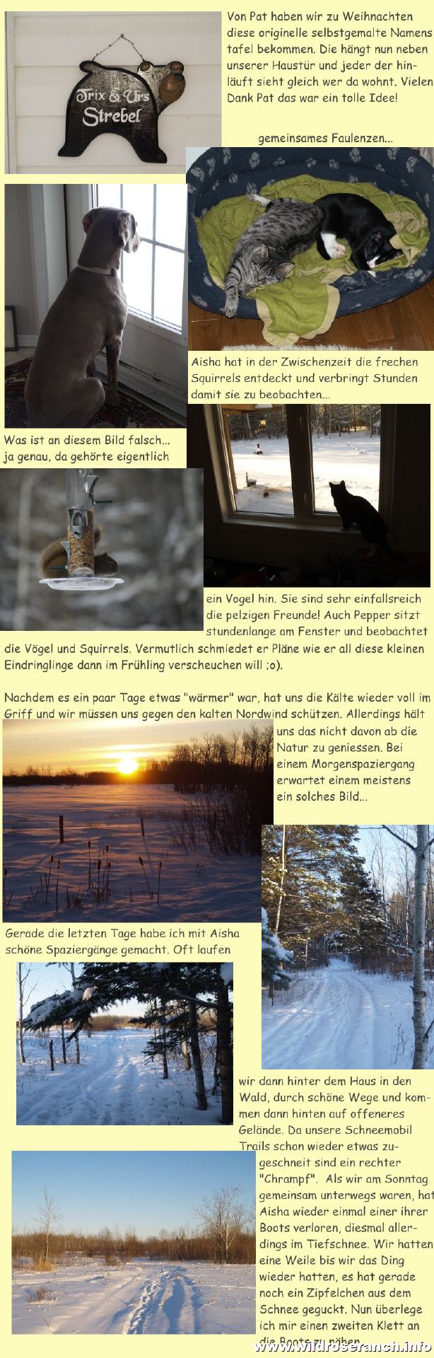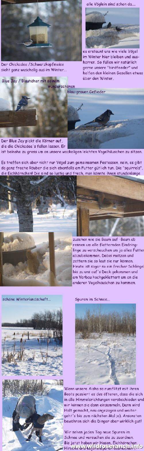 Nun wo wir ein wenig weiter weg von Gimli wohnen, fährt Urs über Mittag nicht mehr nach hause um Aisha etwas Gesellschaft zu leisten. Sie hat sich aber bereits daran gewöhnt etwas länger alleine daheim zu bleiben und macht das sehr gut. Seit neuestem hat sie ja eben auch den "animal channel" (Tier Kanal) entdeckt und ist den ganzen Tag am Eichhörnchen und Vögel beobachten. Da hat sie gerade mal knapp Zeit mich zu begrüssen wenn ich dann nach hause komme Zur Zeit geniessen wir gerade Flip Flop Wetter, die Temperaturen sind gestiegen und sind im einstelligen Minusbereich. Momentan schneit es gerade und am Wochenende meldet sich dann der kalte Winter zurück mit bis zu minus 20 Grad. Na es war schon kälter... |