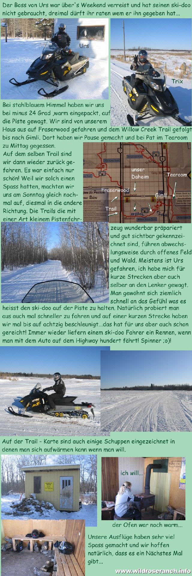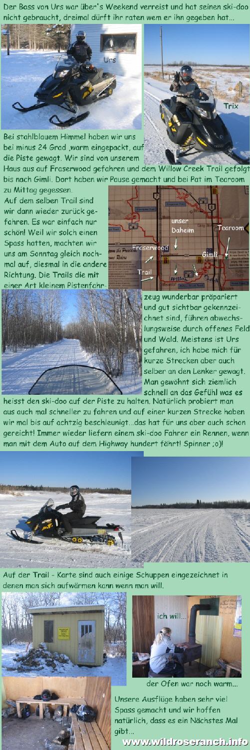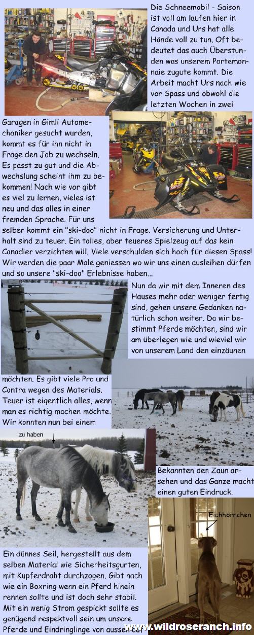 Abstand zu halten. Der Zaun ist auch sehr "luftig", das heisst man sieht eben die Pferde und nicht den Zaun. Nun sind wir am überlegen wieviel wir den einzäunen sollen um unseren vermutlich erst mal zwei Pferden gerecht zu werden. Am besten warten wir auf den Frühling, damit wir auch sehen was wir denn einzäunen. Da haben wir jetzt ja noch ein paar Wochen (Monate?) Zeit um über das Material nachzudenken. Beim Besuch um den Zaun anzusehen haben wir auch noch gerade einen Blick auf ein hübsches Pferd geworfen das zu haben wäre. Ein 7- jähriger Araber der ein neues Plätzchen sucht. Ein hübscher Kerl! Wir sind aber noch etwas vorsichtig, möchten uns erst nochmal ein wenig umschauen, es hat sooooo viele Pferde hier. Wie man sehen kann werden hier die meisten Pferde das ganze Jahr robust gehalten, sie haben einen dicken Winterpelz und suchen nur Schutz vor dem Wind. Wenn man ihnen keinen Windfang zur Verfügung stellt, suchen sie sich einen Platz im Wald/Busch und kommen gut damit klar. Da stellt sich uns die Frage, sollen wir wirklich einen Stall bauen oder genügt ein Unterstand? Natürlich findet man auch hier die Sportställe wo Pferde in Boxen gehalten und im Winter gedeckt werden. Wir werden einen Mittelweg finden...