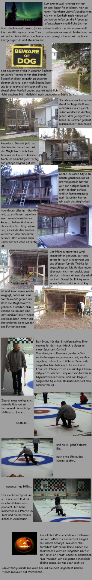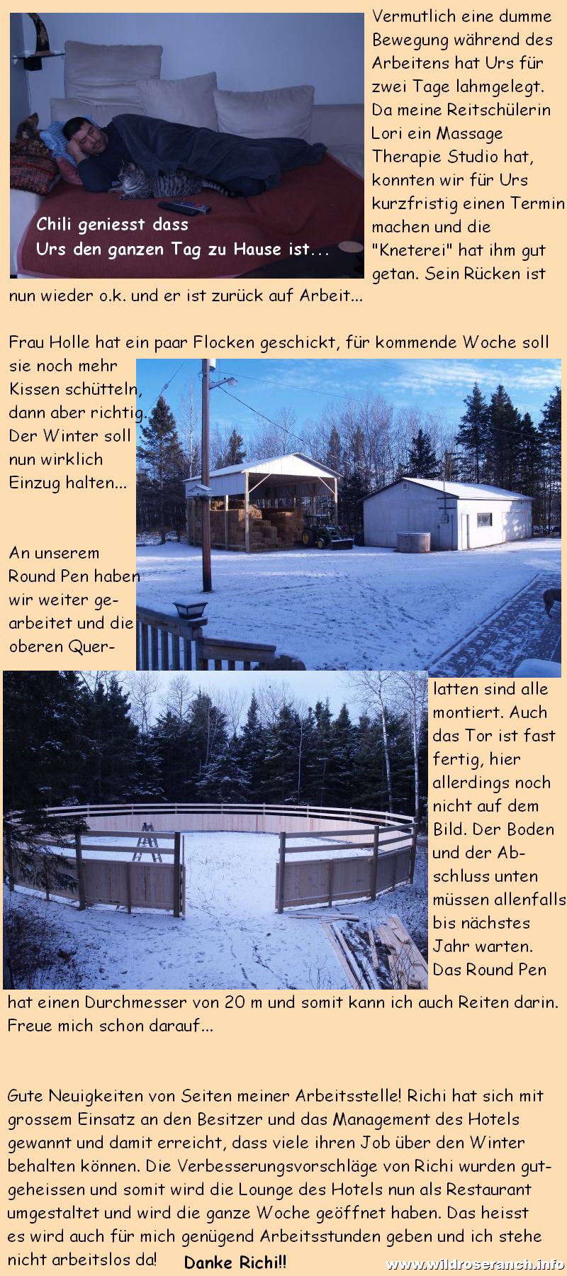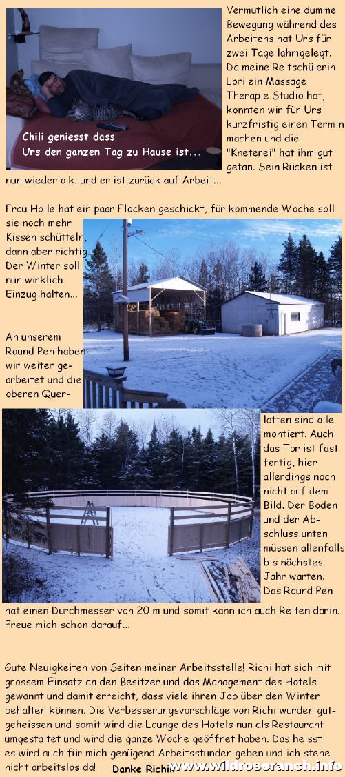 Und dann noch schlechte Nachrichten zuletzt. Nach meinem gelungenen Start im Lakeview Hotel als Koch, haben wir Angestellten am letzten Freitag die Hiobsbotschaft erhalten, dass das Hotel und Restaurant ab 6. Dezember bis voraussichtlich Februar nur noch drei Tage die Woche geöffnet hat. Nachdem das vorgegebene Budget im letzten Jahr nicht erreicht wurde über den Winter, ist diese Entscheidung getroffen worden. Für mich und auch Pat heisst das, dass keine Arbeitsstunden mehr vorhanden sind, weil wir in der Dienstaltersstufe gaaaanz unten stehen. Das heisst...Arbeitslos! Da dieses Problem aber in Gimli nichts Neues ist und man weiss, dass im Winter nicht soviele Jobs vorhanden sind, wird Arbeitslosengeld anstandlos ausbezahlt. Ist eigentlich ein kleiner Trost, ist nämlich ein besch...... Gefühl arbeitslos zu sein. Ich halte meine Augen offen, arbeite an meiner Reiterkundschaft und lasse es auf mich zukommen. Zum Glück hat Urs einen "wintersicheren" Job wo wir uns keine Sorgen machen müssen! |