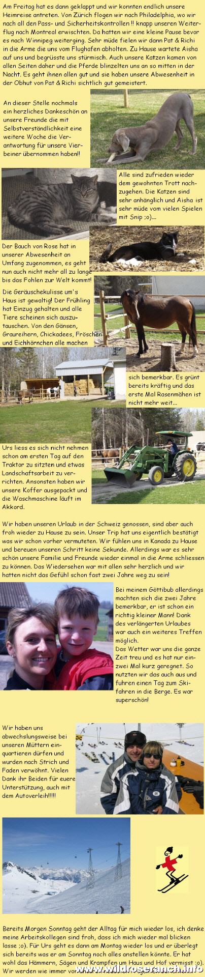 So lange hatten wir eigentlich nicht geplant in der Schweiz zu bleiben. Wegen des Vulkanausbruches auf Island sitzen wir hier fest und müssen wortwörtlich warten bis die Luft wieder rein ist. Fast jeden Tag fuhren wir auf den Flughafen Kloten um wieder neue Flüge zu buchen, weil die alten fortlaufend anulliert wurden. Nun steht unser nächster Flug für Freitag! fest, vorher geht gar nichts mehr. Nun heisst es einfach Geduld haben und hoffen die Situation normalisiert sich wieder. Obwohl wir selber davon betroffen sind, finden wir es erstaunlich wie die Natur dem Menschen Grenzen aufweist. Ein herzliches Dankeschön unseren Babysittern zu Hause, wir wissen unsere Tiere und unser Haus ist in guten Händen! Damit hat ja wohl niemand gerechnet |