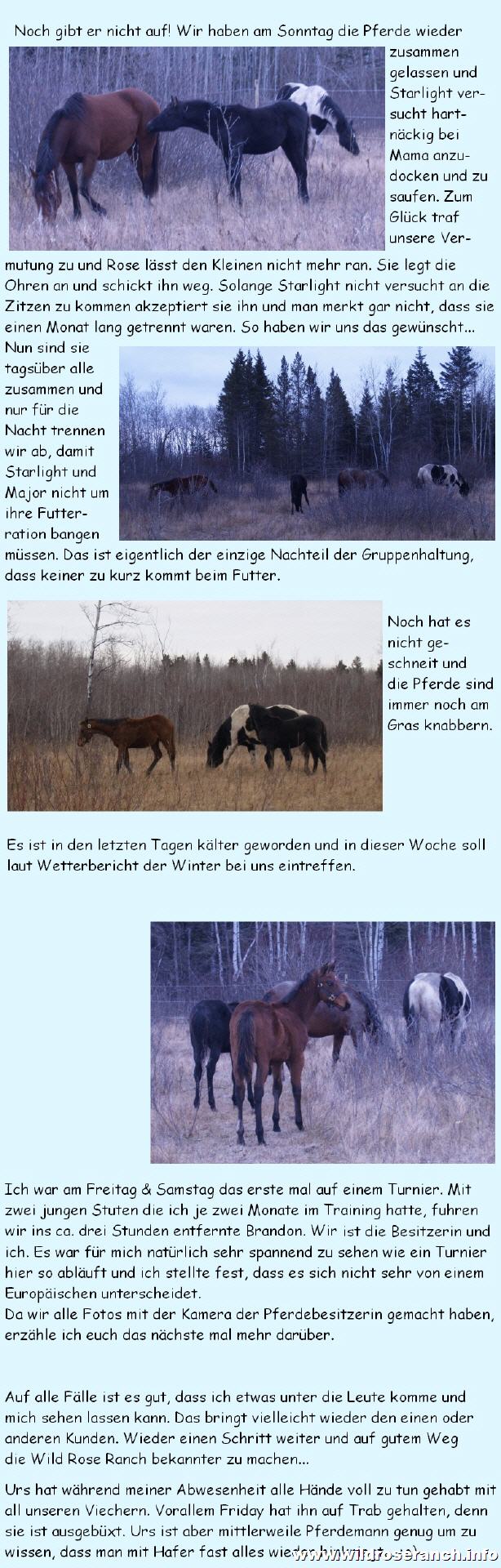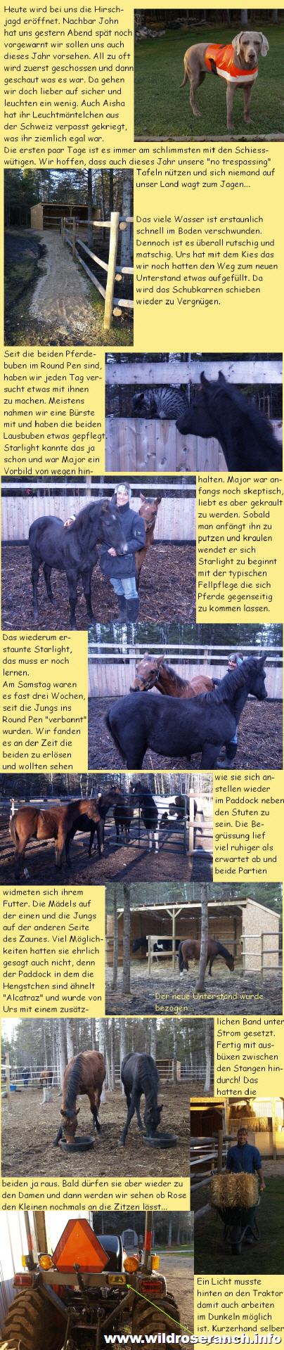 Major, immer noch sehr scheu, fand es absolut grässlich eine Spritze verpasst zu bekommen. Ich wundere mich jetzt noch wie wir das geschaft haben. Danach legte er sich bald nieder und fiel in einen tiefen Schlummer. Urs stellte zusätzlich noch eine Lampe auf damit wir genug Licht hatten. Lisa machte sich dann sofort daran die zum Glück nicht sehr tiefe Wunde zu nähen. Sie war aber zu grossflächig um Sie nicht zu nähen. Nach wenigen Minuten war der Spuck vorbei. Major regte sich schon wieder, stand sehr schnell auf und torkelte umher. Fiel wieder hin, stand wieder auf, es war nicht schön anzusehen. Wir haben ihn so gut es ging gestützt. Bald stand er ruhiger, legte seinen Kopf auf meine Schulter und entspannte sich ein wenig nach der Aufregung. Wir holten dann sofort Starlight wieder dazu. Den hatten wir vorsichtshalber zu den Stuten gebracht, weil wir keine kleine schwarze neugierige Nase gebrauchen konnten ;o). Da war die Welt auch für Major wieder in Ordnung und die beiden Jungs fingen an an ihrem Heu zu knabbern. Nun hoffen wir die Wunde verheilt schön. Es ist vielleicht ein Vorteil, dass es so kalt ist....keine Fliegen! |