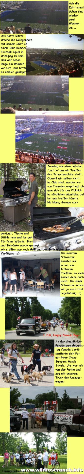Seit Tagen haben wir trockenes Wetter und es ist schwül. Das führt auch dazu, dass es unglaublich viele Moskitos hat und wie auch letztes Jahr raucht es fast ununterbrochen um unser Haus um mit einem "smudge" die Plagegeister zu vertreiben. Auch die "Fishflies" sind wieder am Gimli erobern und bedecken ganze Gebäude und sonst so alles was sie finden. In eine paar Wochen sind die aber wieder weg und ein fürchterlicher Gestank bleibt zurück ;o). Gestern Abend mussten Urs und ich noch eine Rettungsaktion durchführen. Pepper hat doch tatsächlich eine kleine/junge Ente gefangen und sie vor meinen Füssen losgelassen. Entlein versucht wegzufliegen, zwei Katzen hinterher (wohlgemerkt im Dunkeln!) und ich hintendrein. So richtig fliegen konnte das arme Ding nicht mehr oder noch nicht und flatterte am Boden rum. Irgendwann konnte ich dann endlich meine Jacke über das Tierlein werfen. Wir haben die Ente dann zum Ditch gebracht wo sie im Schilf und Wasser verschwand. Das ist es was wir so machen kurz vor dem Zubettgehen |