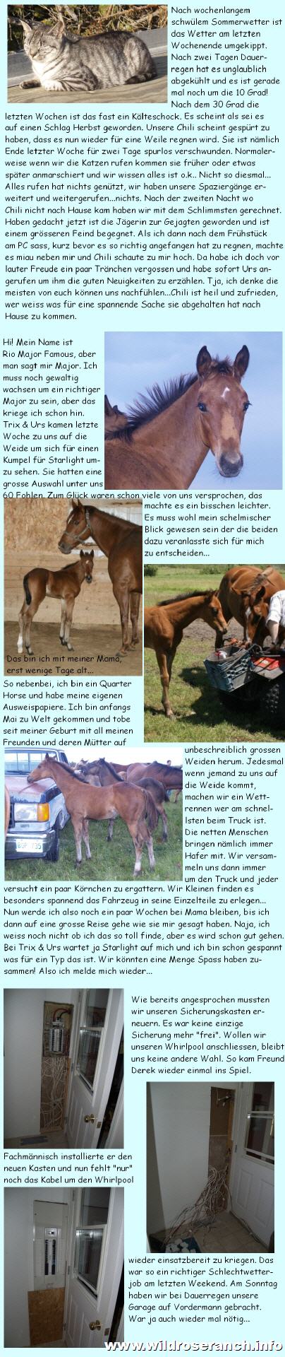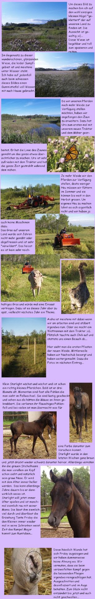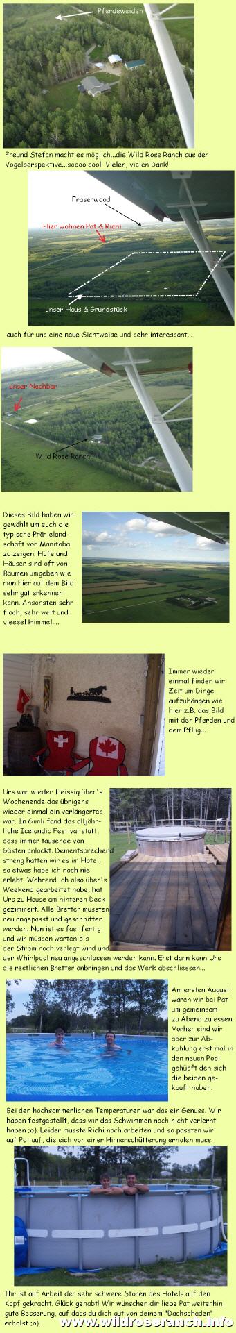 Gasflasche explodiert und hat uns in einen Feuerball gehüllt. Glücklicherweise haben alle sehr schnell reagiert. Einen Brand hat es in diesem Sinne nicht gegeben und wir waren sehr schnell im Spital. Meine Kollegin und ich haben zum Glück nur leichte Verbrennungen an Händen, Armen und im Gesicht. Wir hatten Glück im Unglück und werden zumindest im Gesicht vermutlich keine Narben davon tragen. Urs wurde von Pat informiert was passiert ist und er ist nach Gimli ins Spital "geflogen" mit dem Auto. Er hat mir dann ein paar Stunden lang meine Verbrennungen mit sterilisiertem Wasser gekühlt. Die Krankenschwestern kamen fast nicht mehr nach mit Wasser liefern ;o). Nach etwa vier Stunden durften wir nach Hause mit Verbänden an Händen und Armen mit Anweisungen am nächsten Tag zur Kontrolle zu erscheinen. Nun nach drei Tagen sehe ich aus als wäre ich zu lange an der Sonne gelegen mit einigen dunkleren Stellen. Meine Augenbrauen und Wimpern sind angesengt und sehen etwas kahl aus, heute kann ich schon darüber schmunzeln. An meiner Hand ist der Verband bereits weg, nur meinen Arm hat es etwas schlimmer erwischt und ich werde noch einige Tage zum Verband wechseln gehen müssen, damit es sicher keine Infektion gibt. Morgen Mittwoch geht es wieder zurück zur Arbeit fürs' erste vermutlich mal in der "kalten Küche" ;o)... |