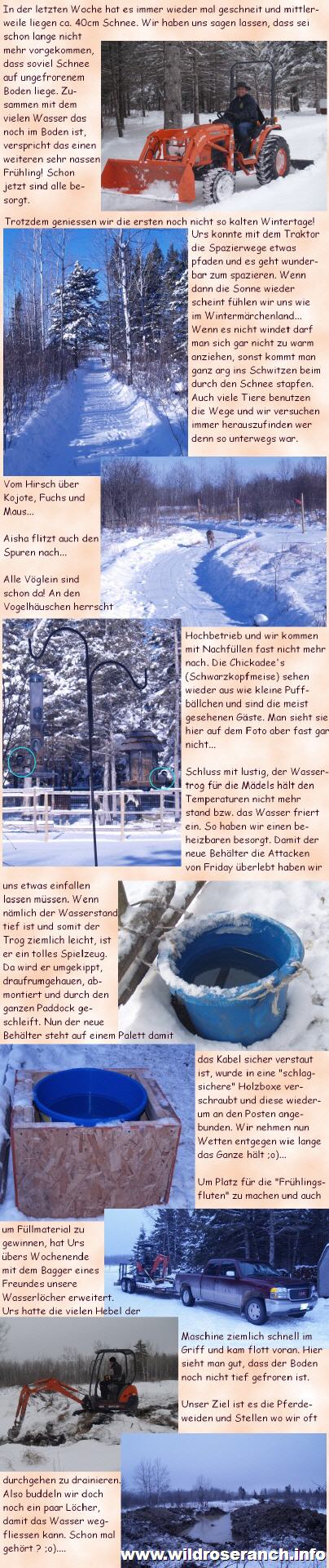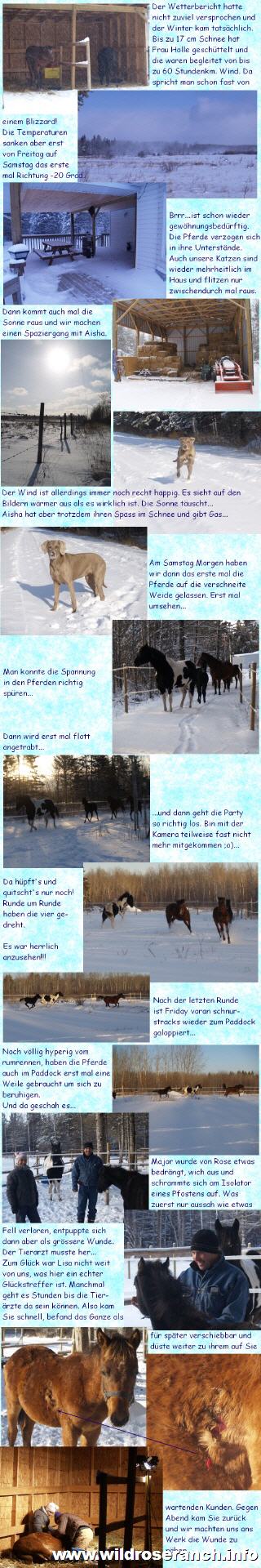 Major, immer noch sehr scheu, fand es absolut grässlich eine Spritze verpasst zu bekommen. Ich wundere mich jetzt noch wie wir das geschaft haben. Danach legte er sich bald nieder und fiel in einen tiefen Schlummer. Urs stellte zusätzlich noch eine Lampe auf damit wir genug Licht hatten. Lisa machte sich dann sofort daran die zum Glück nicht sehr tiefe Wunde zu nähen. Sie war aber zu grossflächig um Sie nicht zu nähen. Nach wenigen Minuten war der Spuck vorbei. Major regte sich schon wieder, stand sehr schnell auf und torkelte umher. Fiel wieder hin, stand wieder auf, es war nicht schön anzusehen. Wir haben ihn so gut es ging gestützt. Bald stand er ruhiger, legte seinen Kopf auf meine Schulter und entspannte sich ein wenig nach der Aufregung. Wir holten dann sofort Starlight wieder dazu. Den hatten wir vorsichtshalber zu den Stuten gebracht, weil wir keine kleine schwarze neugierige Nase gebrauchen konnten ;o). Da war die Welt auch für Major wieder in Ordnung und die beiden Jungs fingen an an ihrem Heu zu knabbern. Nun hoffen wir die Wunde verheilt schön. Es ist vielleicht ein Vorteil, dass es so kalt ist....keine Fliegen! |